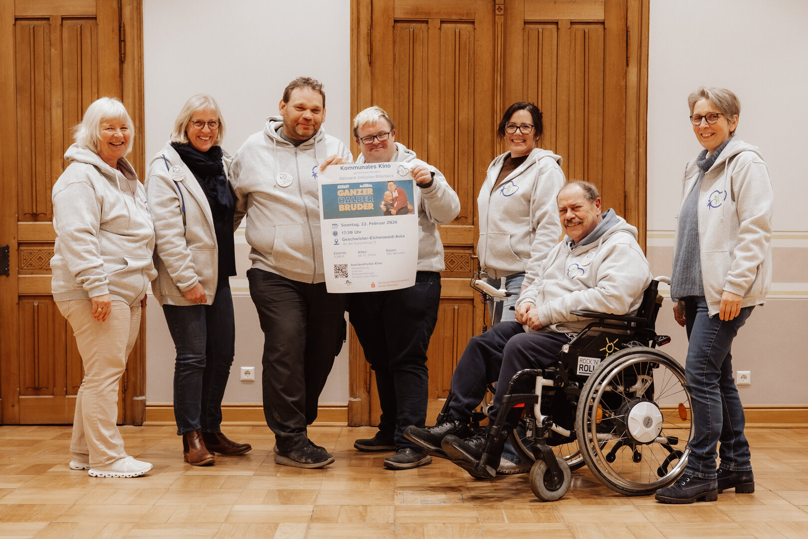 Bildunterschrift: Mitglieder des Netzwerks Inklusion Billerbeck präsentieren das Plakat zum barrierefreien Kinoabend „Ganzer halber Bruder“ in der Geschwister-Eichenwald-Aula.