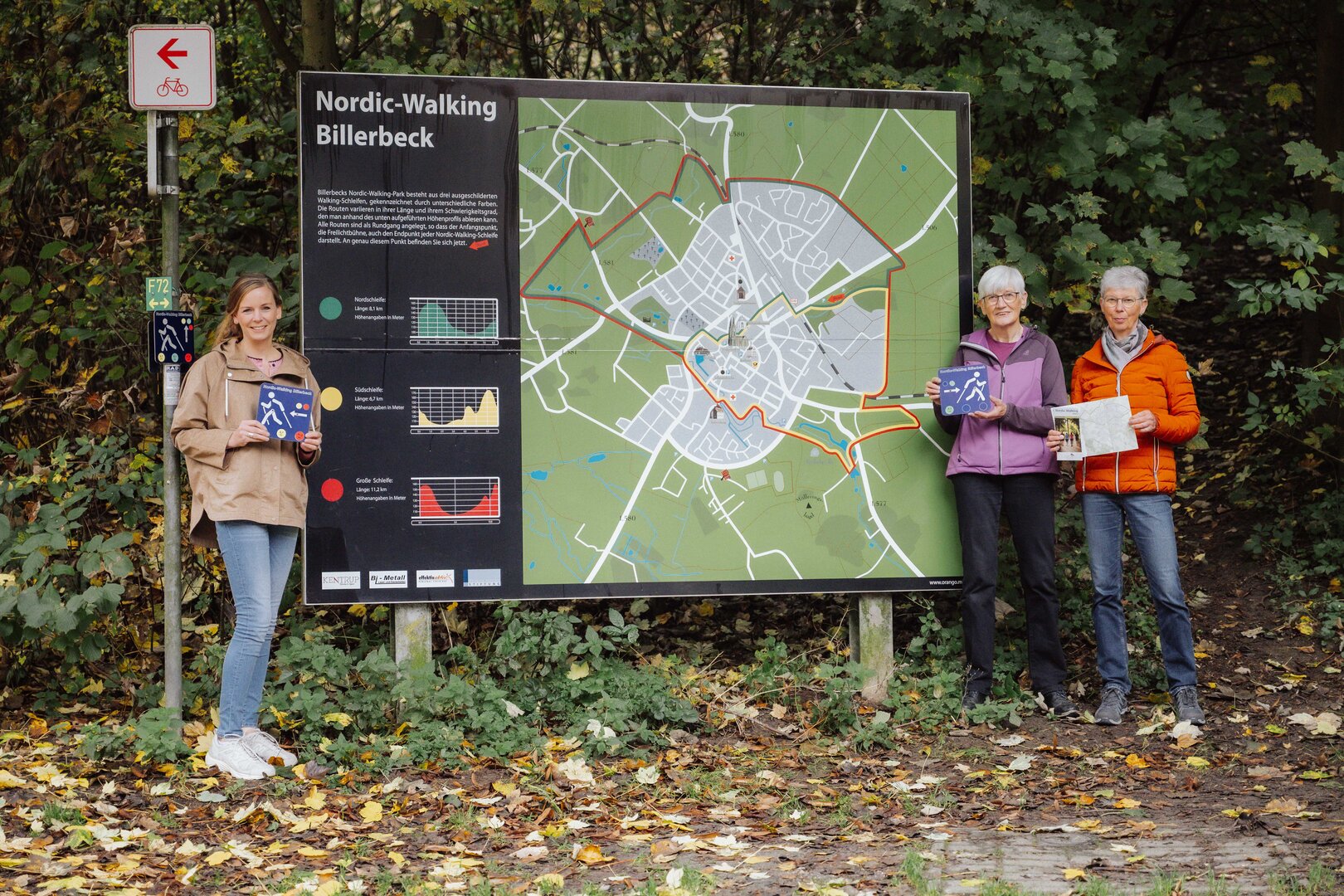 Die drei Nordic-Walking-Runden starten an der Freilichtbühne in Billerbeck. Gudrun Wasmer, Rita Robert (beide Stadt Billerbeck) und Maria Diecker präsentieren gemeinsam die Streckenverläufe, die auf der großen Übersichtstafel anschaulich erklärt werden.