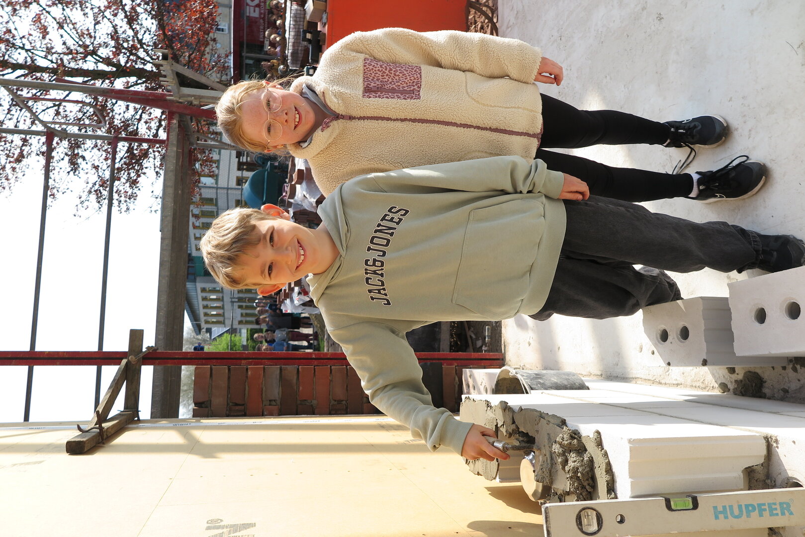 Ein besonderes Highlight für alle Beteiligten war, dass Frieda Ueding und Loui Busse nicht nur die Urkunde präsentierten, sondern auch aktiv beim Einmauern der Zeitkapsel mitwirkten. Mit viel Engagement und sichtbarem Talent verteilten sie den Mörtel auf den Steinen und wurden so selbst Teil dieses symbolischen Moments.